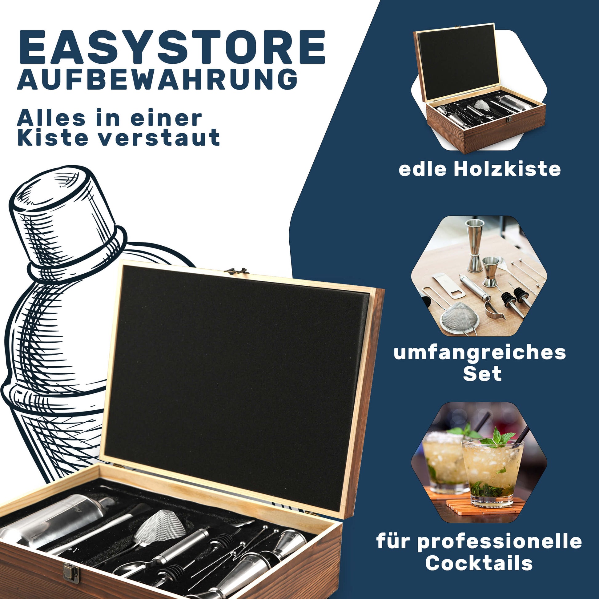 Jedes Teil wurde mit Liebe zum Detail entwickelt und aus hochwertigem, rostfreiem Edelstahl gefertigt. Die stabile Verarbeitung garantiert erstklassige Qualität für den langfristigen Einsatz. Das Set bietet alles, was du für professionelle Cocktail-Kreationen brauchst – von klassischen Drinks bis hin zu modernen Signature-Cocktails.